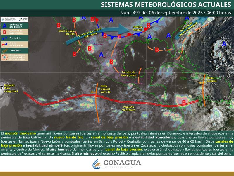 Ciudad de México, 6 de septiembre de 2025.- El monzón mexicano y la interacción de frentes fríos con canales de baja presión generarán condiciones climáticas severas en varias regiones del país. Las lluvias serán particularmente intensas en zonas como Durango (75 a 150 mm) y se prevén eventos muy fuertes (50 a 75 mm) en estados como Zacatecas, Nuevo León y Tamaulipas. Estas precipitaciones estarán acompañadas de descargas eléctricas, rachas de viento de hasta 60 km/h y posibles caídas de granizo.